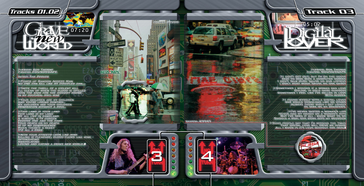 The first song "Grave New World" of course sets both the mood and the scene for the whole album, and the illustrative image that accompanies it in the booklet does so as well. The band apologized for the fact that all the location photos were in the rain, but I thought that worked better to give the all the images a more depressing look to them, since Times Square still looks bright at night. I intended for the elements overlaying the photos to look like the "Big Brother" entity was monitoring the public electronically. An element that Rob Thorne particularly liked was the lack of private identity, symbolized by the ten-digit number attached to the man as he crosses the street. You can also see "Big Brother" above the Jumbotron in the background. It was my idea to name him/it "The Server", which I thought had a kind of combination Microsoft/Orwellian feel to it in this context.